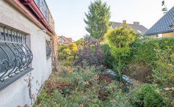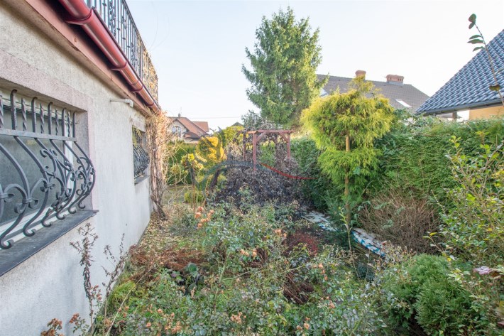 Działka o powierzchni ok. 350 m² została już zagospodarowana – ogród z nasadzeniami zapewnia prywatność i przestrzeń do wypoczynku.