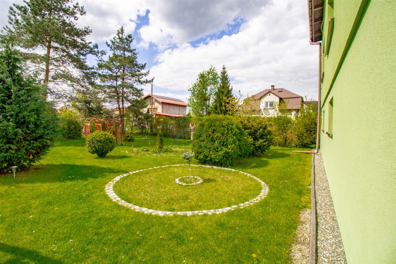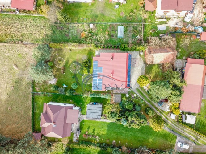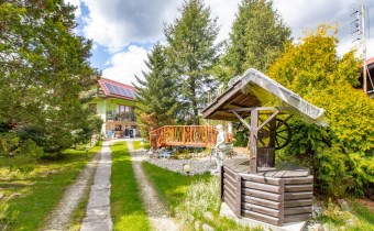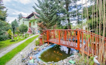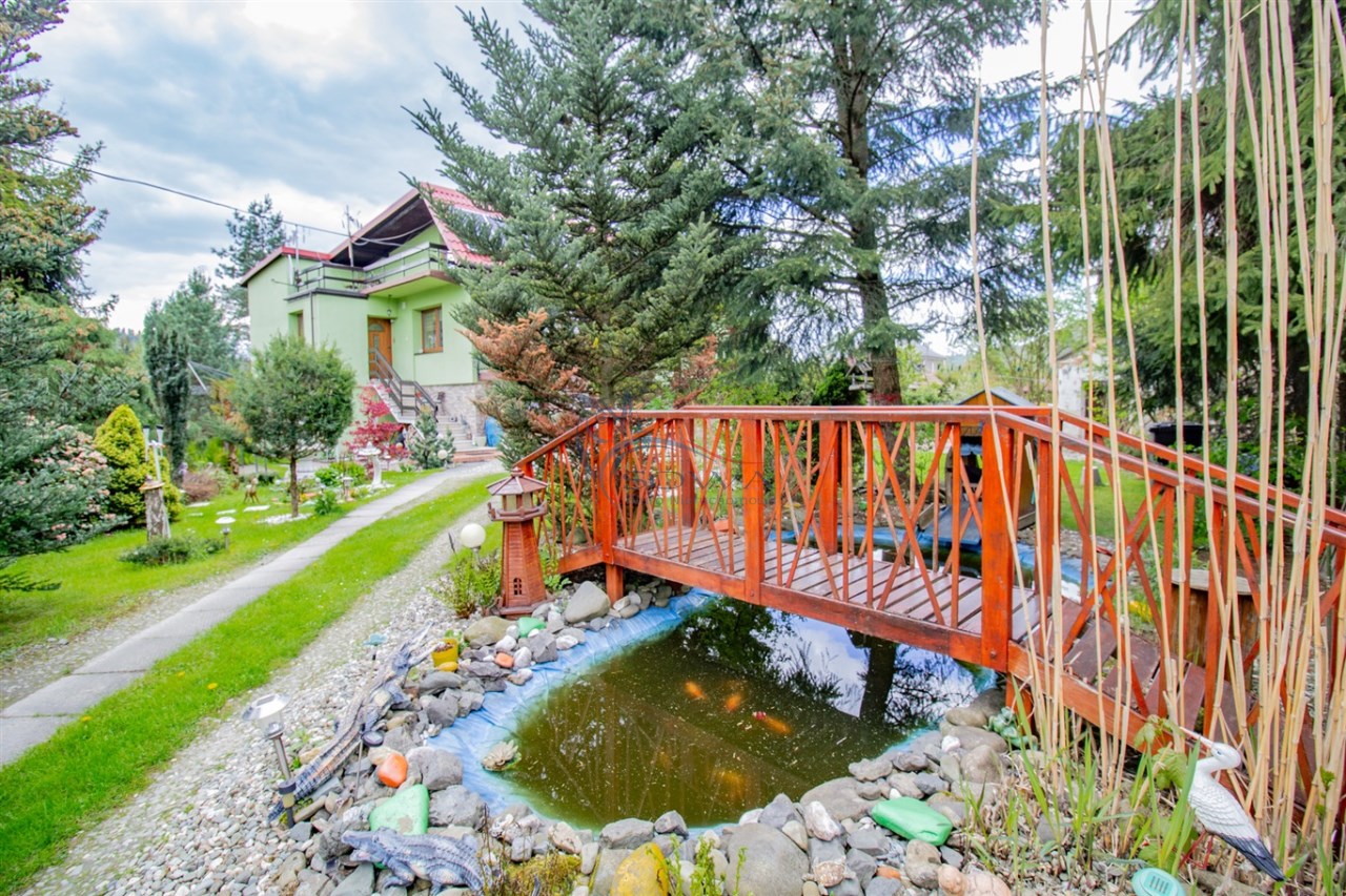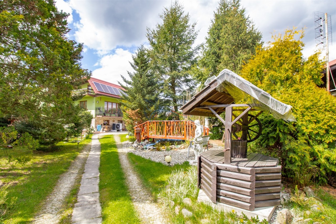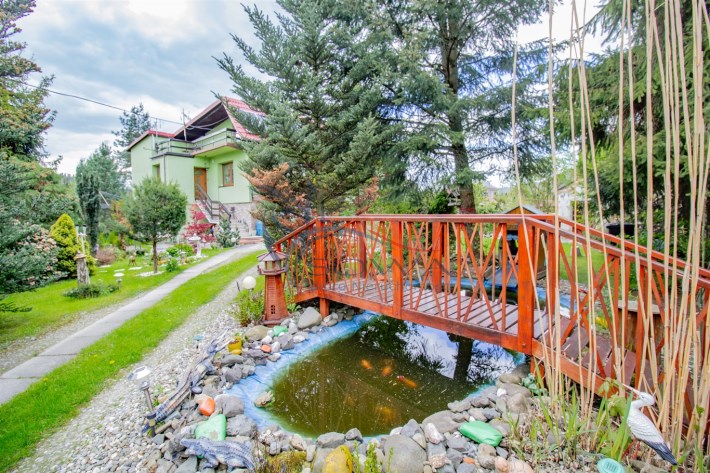 Piękna działka została w pełni zagospodarowana. Przed domem znajduje się oczko wodne. Ponadto do dyspozycji jest również budynek gospodarczy znajdujący się w rogu ogrodu.