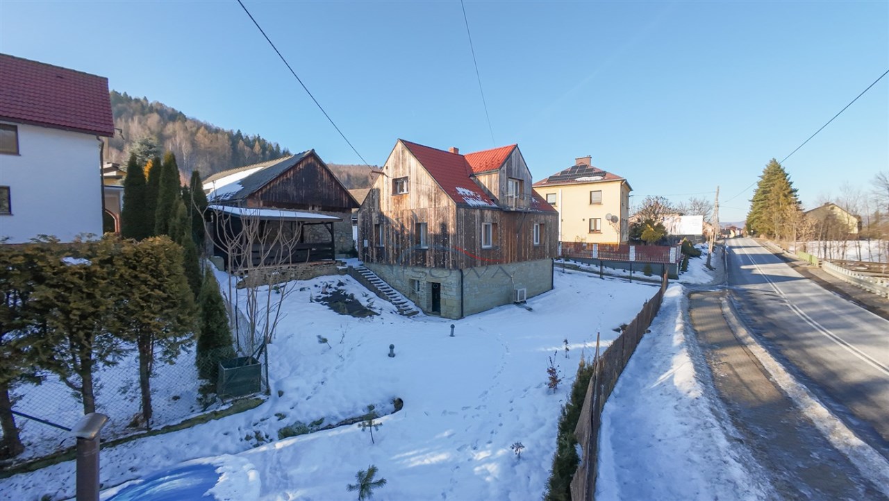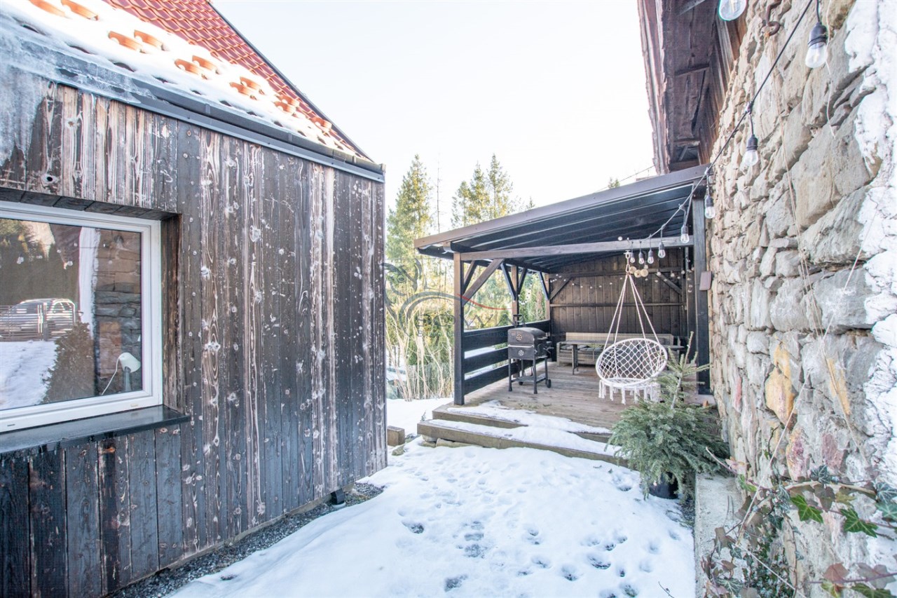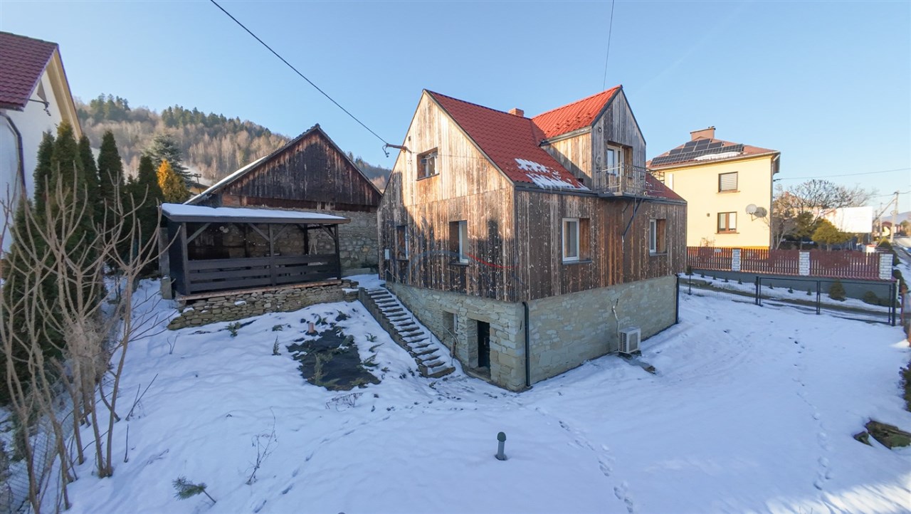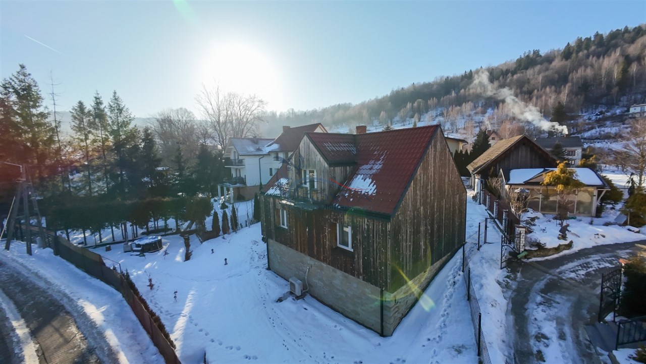 Dom jest murowany, ocieplony wełną mineralną i wykończony paloną deską, co nadaje mu charakterystyczny, górski styl. Odnowiona elewacja oraz starannie wykonane detale sprawiają, że nieruchomość prezentuje się spójnie i estetycznie.