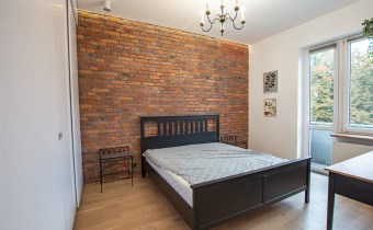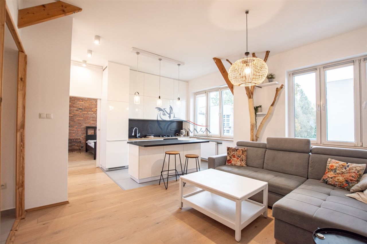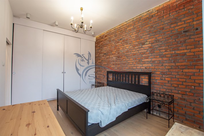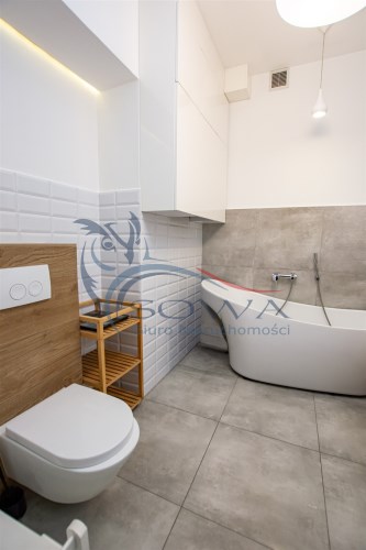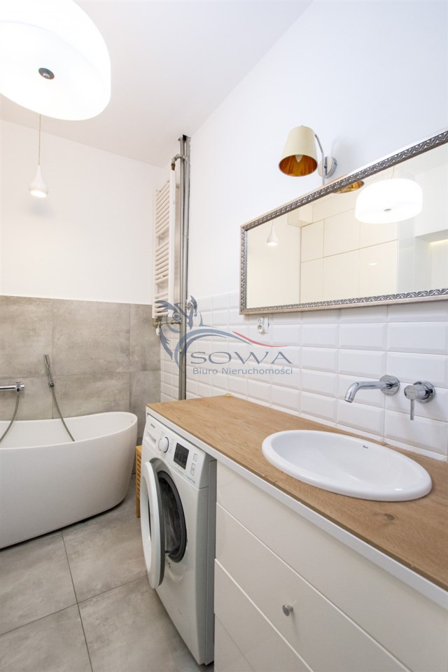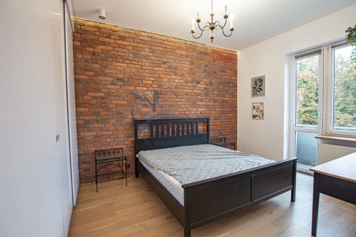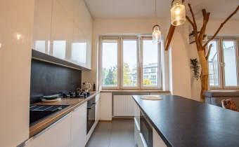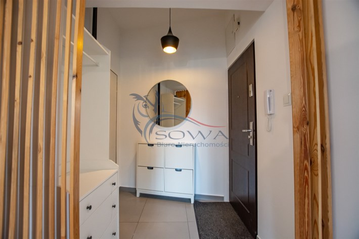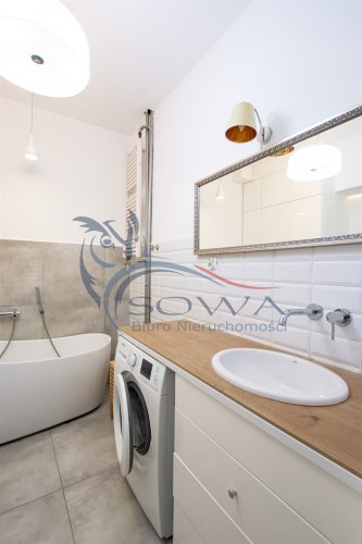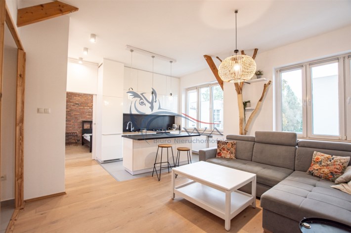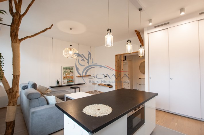 Mieszkanie sprzedawane jest z pełnym umeblowaniem i sprzętem widocznym na zdjęciach. Kuchnia w zabudowie z wyspą, sprzęt AGD, w sypialni pojemne szafy w zabudowie.
